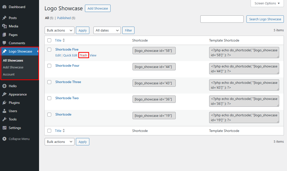 - Hover over the logo showcase title and click “Trash” to move it to the trash bin.